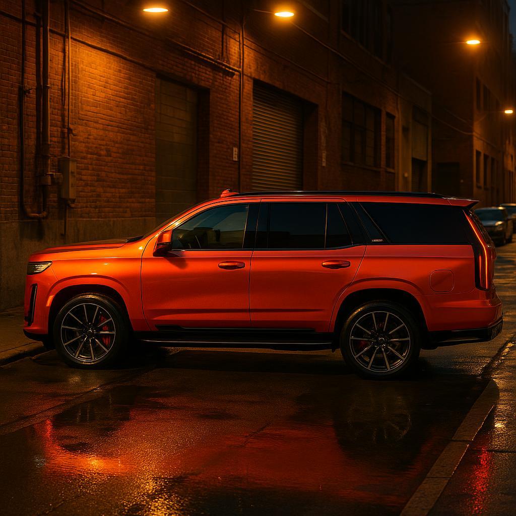 From a styling perspective, finish is metallic with a high-gloss sheen. Texture is smooth with no visible pattern, featuring a consistent metallic flake dispersion at a fine scale. As lighting conditions shift, opacity is solid with no visible translucency. It is a practical choice for premium wrap programs focused on color identity and finish consistency.